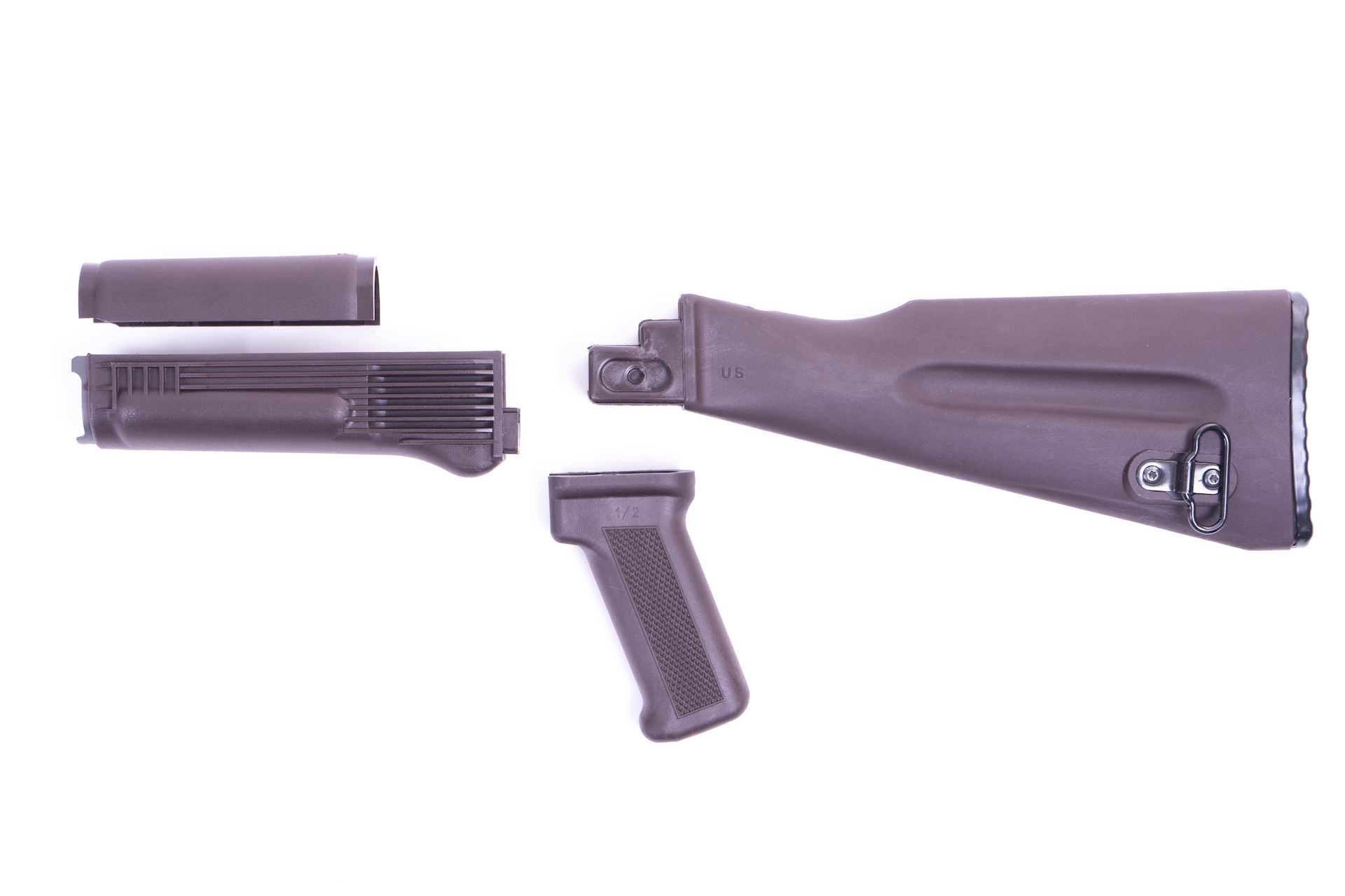 Four-piece US made mil-spec stock set. Warsaw Pact length glass reinforced polymer buttstock for stamped receivers in Plum color. The lower handguard features stainless steel heat shield. The buttstock is assembled with US made bind free sling swivel and features spring loaded trap door and compartment for the cleaning kit. Available in additional colors: Desert Sand Black and OD Green.