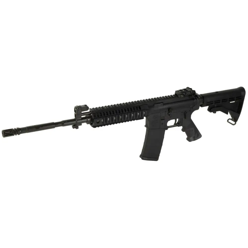 Direct Gas Impingement Semi Automatic Rifle – 5.56 NATO (accepts 5.56 NATO and .223 Remington) – 16.1 Chrome Lined M4 Profile Barrel – 1:7 Twist Rate – Threaded 1/2 x 28 TPI – Birdcage A2 Style Flash Hider – Forged 7075 T6 Aluminum Upper/Lower Receivers – Flat Top Upper Receiver – M4 Feed Ramps – Reversible Selector Switch – Carbine Length Gas System – Polymer Hand Guard – A2 Front Sight – A2 pistol Grip – Magpul Flip Up Rear – 30 Round Magazine (Magpul PMAG) – Accepts all standard pattern M4/AR-15 Magazines – Standard Mil-Spec Trigger – 4 Position Collapsible Stock Carbine Stock – Front Barrel Lug – Ejection Port Cover – Made in the USA – Overall Length 32 Collapsed / 35 Extended – Overall Weight 6.95lbs – Hard Coat Anodized Finish – Matte Black Finish