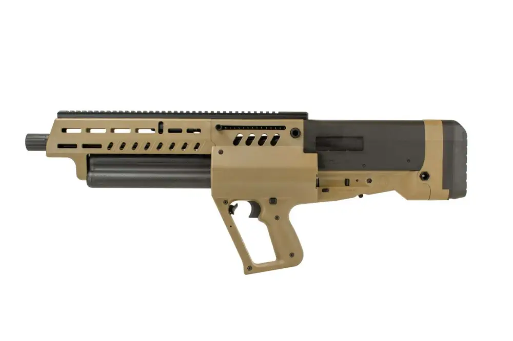 The Tavor TS12 12 gauge shotgun is a gas regulated bullpup shotgun that can be configured for either right or left side ejection and operation. It feeds from one of three magazine tubes which can hold four 3 inch shotgun shells or five 2