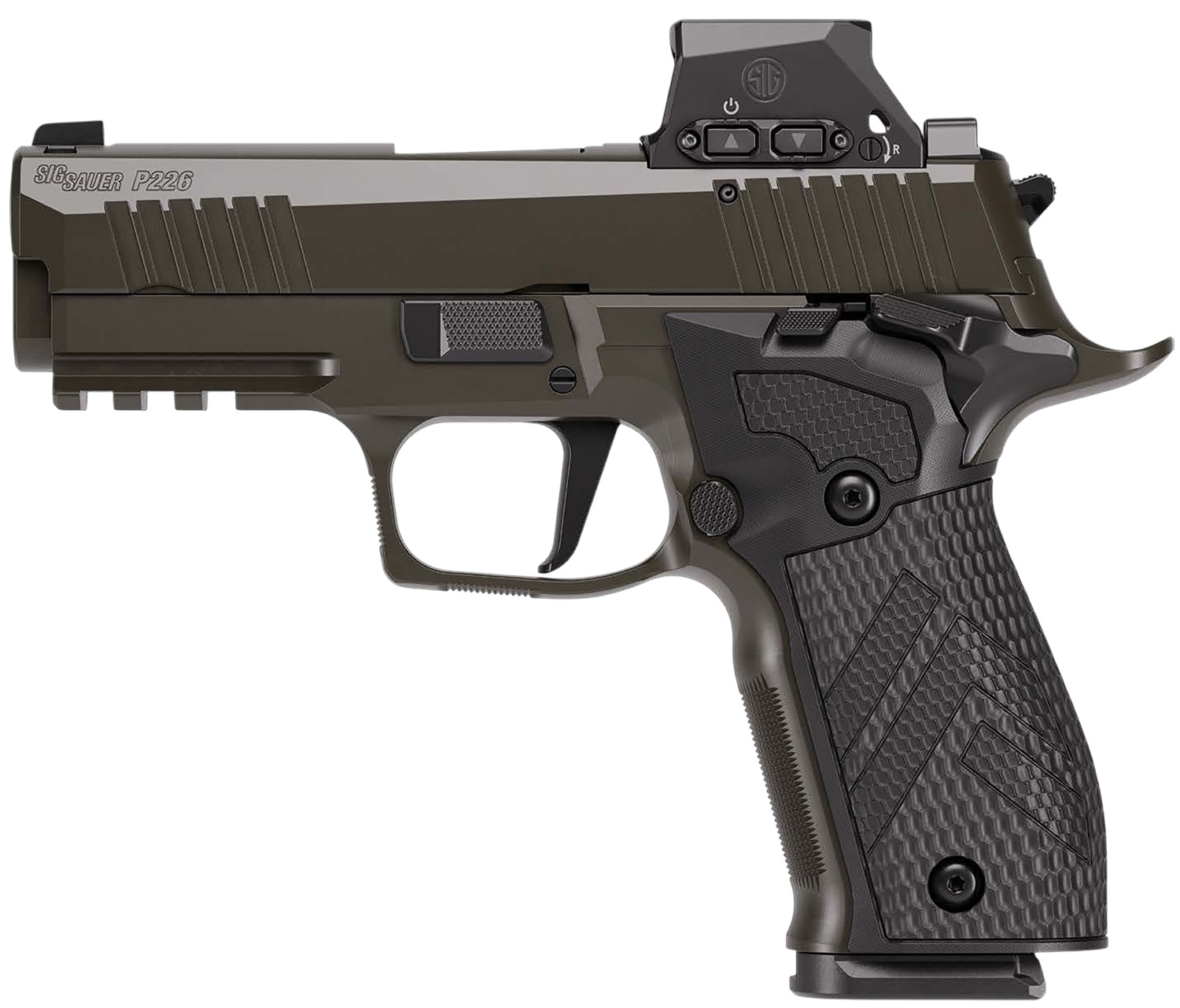 The P226X Legion offer enhanced ergonomics for superior comfort, flush-fit 18-round magazines for increased capacity, low profile decocker, G10 Legion Pattern grip panels by HOGUE and finely tuned adjustable trigger systems to adapt to your shooting style. Optic-ready for SIGLOC Pro, ROMEO1Pro, ROMEO2, DPP and RMR footprints. Compatible with X5 slides, controls, grips and trigger systems. Includes ROMEOX Pro SIG-LOC and three magazines.