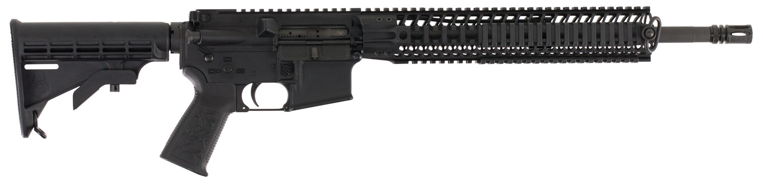 Spike’s Tactical ST-15 LE M4 Carbine Rifle is designed for law enforcement. The chrome moly vanadium barrel is chrome lined, threaded, has an A2 flash hider, and is Mil-Spec phosphate coating. The 7075-T6 lower features proprietary low shelf, RDIAS compatibility, and has a hard coat anodized finish. Its proprietary gas tube has a black nitride finish both inside and out, while the charging handle has a Mil-Spec type three coating. The Spikes Tactical M4 stock features 6-position mil-spec buffer tube and a Spikes pro grip. The ST-15 LE M4 Carbine also has a jeweled mil-spec trigger, A2 front with a Magpul MBUS rear sights, and sling swivel. It includes a hard case. This model has a 16″ barrel and a 12″ BAR2 rail. It comes with no magazine.