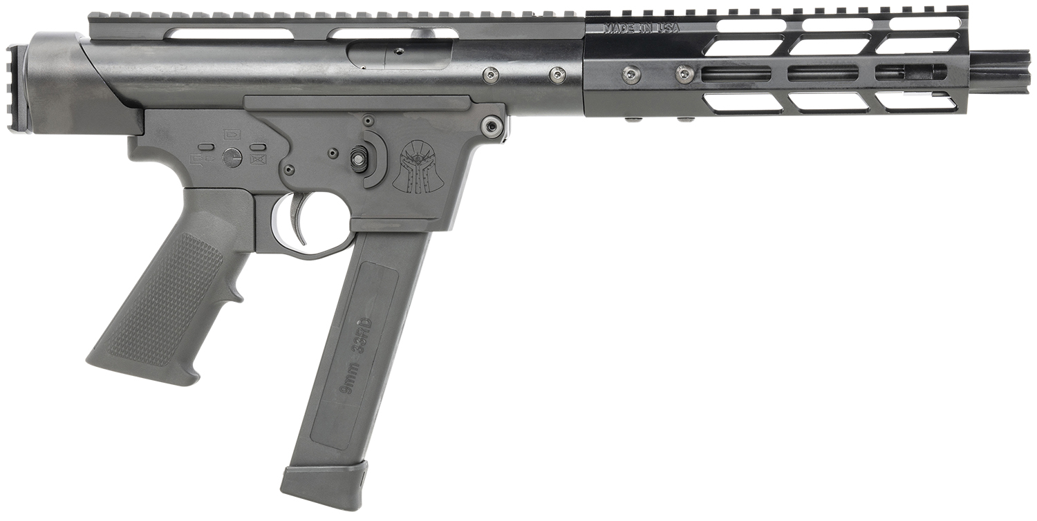 Chambered in 9MM and feeding from Glock magazines, it comes standard with a 8.5 inch 416R Stainless Steel barrel. The bolt, front trunnion, and steel upper receiver all feature a Nitrided finish for excellent corrosion and wear resistance. The lower receiver is milled out of Billet Aircraft grade aluminum with a Mil Type 3 Hardcoat Anodize. At the heart of the TAC-9 is an all steel bolt which works with a standard AR-15 fire control group. This offers superior reliability and maintains the same manual of arms that users are accustomed to, decreasing training time on the new platform. You can drop in a lot of your favorite aftermarket parts as the Billet Lower Receiver is milled out like a standard AR-15 trigger pocket.